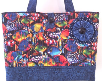 Nuclear Fishin - Big Large Colorful Beach Bag Market Tote Shopper Purse Quilted Handbag - Bright Tropical Fish on Black w/ Indigo Navy Blue